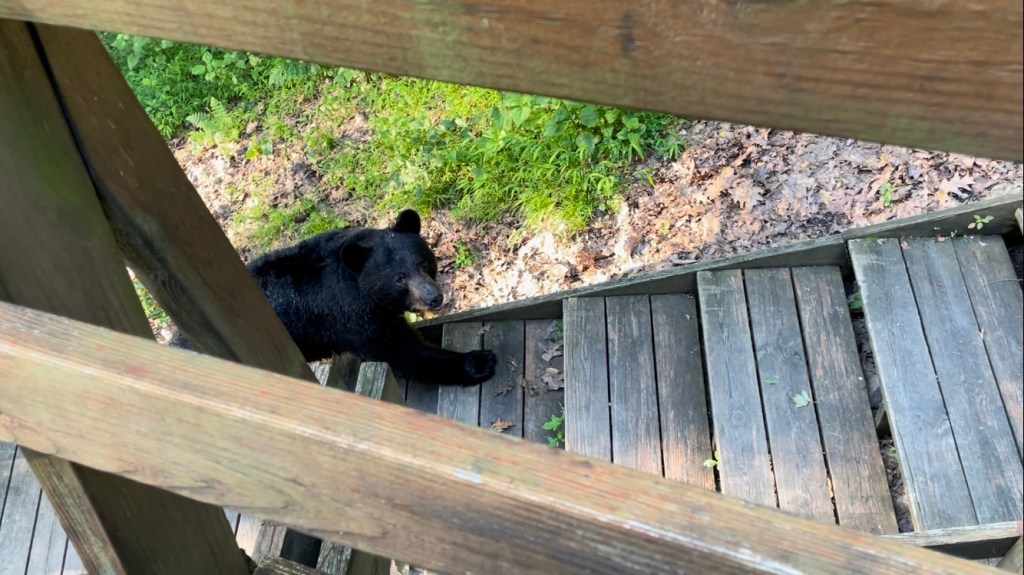 The next morning, my husband discovered the bear on the bottom deck of the cabin walking up the stairs. He was coming up the steps. We stood there quietly to observe it. It was thrilling to be so close to a wild animal like that.